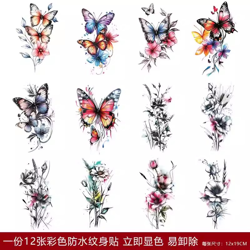 新款泼墨风彩色花朵蝴蝶遮剖腹产竖疤纹身贴防水国风素描腹部肚子新款泼墨风彩色花朵蝴蝶遮剖腹产竖疤纹身贴防水国风素描腹部肚子